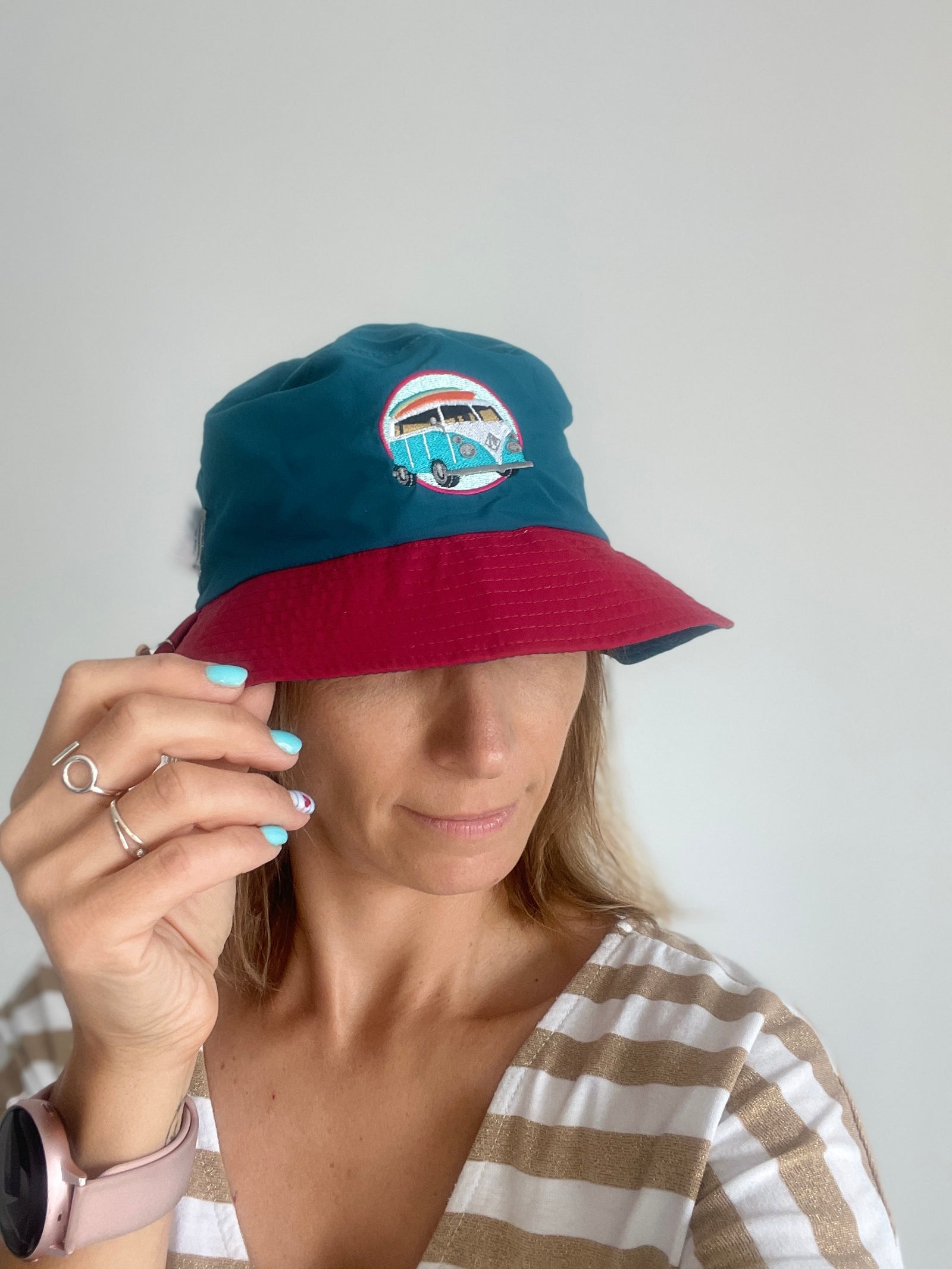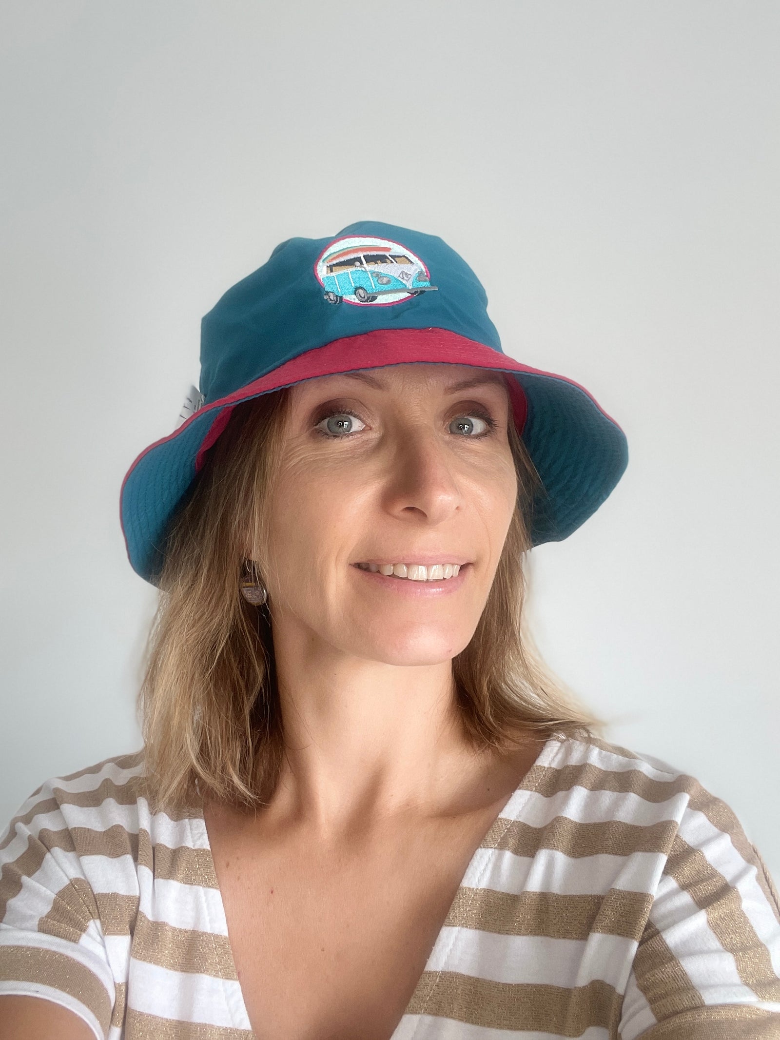Le bob en coton est disponible en 3 coloris : bleu ciel, bleu / rouge et jaune !